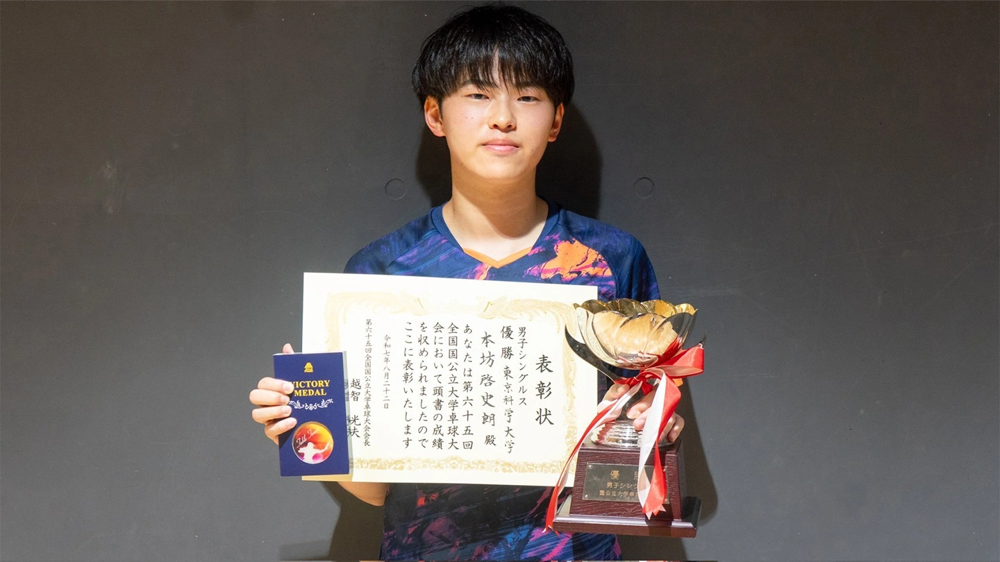 Keishiro Hombo, a 3rd-year Mechanical Engineering student, has won the singles title at the 65th National and Public Universities Table Tennis Tournament, held from August 18 to 22 in Fukuyama City, Hiroshima Prefecture.