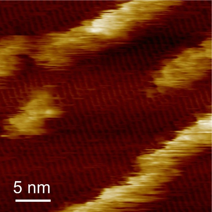 They then replaced the droplet of peptide solution with a droplet of hemin solution and used AFM to observe the configuration of the hemin as it bound to the peptide structure. They found the hemin aggregated on the dipeptide structures, and further observations with high-speed AFM revealed that the hemin formed wires as well as aggregates, and that while the wires were stationary the aggregates seemed to hop along and between rows of the dipeptide (Figure 3).