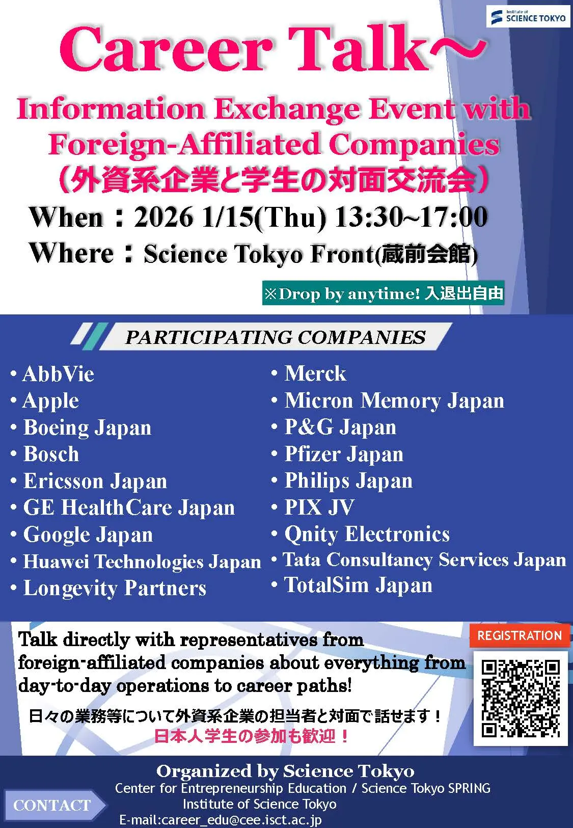 The Center for Entrepreneurship Education / Science Tokyo SPRING will host the “Career Talk – Information Exchange Event with Foreign-Affiliated Companies.”