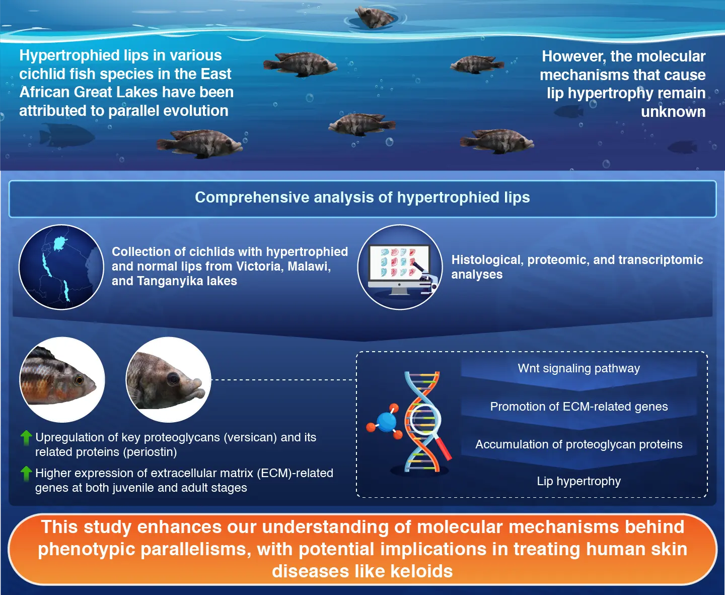 In a recent study, researchers have discovered that the genes related on extracellular matrix (ECM) and the Wnt signaling pathway characterize the independently acquired lip hypertrophy in cichlids of East African Great Lakes. Through advanced omics-based experiments and comparative histological analyses, they found that hypertrophied lips of cichlids had a larger proteoglycan-rich layer. This study provides vital insights into the evolutionary biology of lip hypertrophy in cichlids of East African Great Lakes.