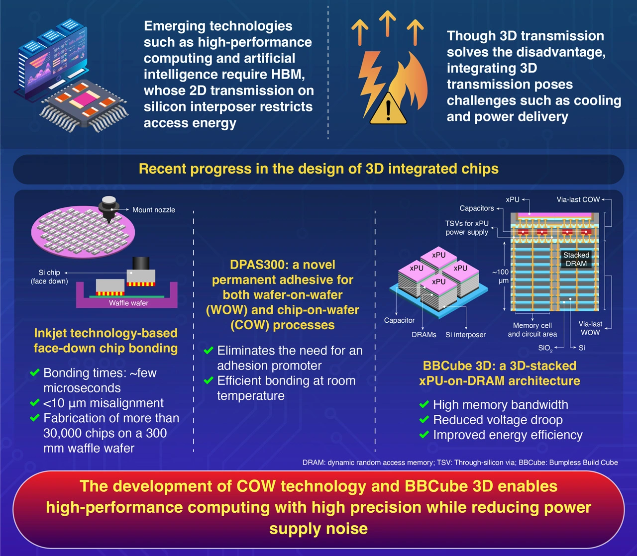 A novel power supply technology for 3D-integrated chips has been developed by employing a three-dimensionally stacked computing architecture consisting of processing units placed directly above stacks of dynamic random access memory. Towards realizing this, researchers developed key technologies involving precise and high-speed bonding technique and adhesive technology. These new technologies can help in addressing the demands of high-performance computing applications, which require both high memory bandwidth and low power consumption with reduced power supply noise.