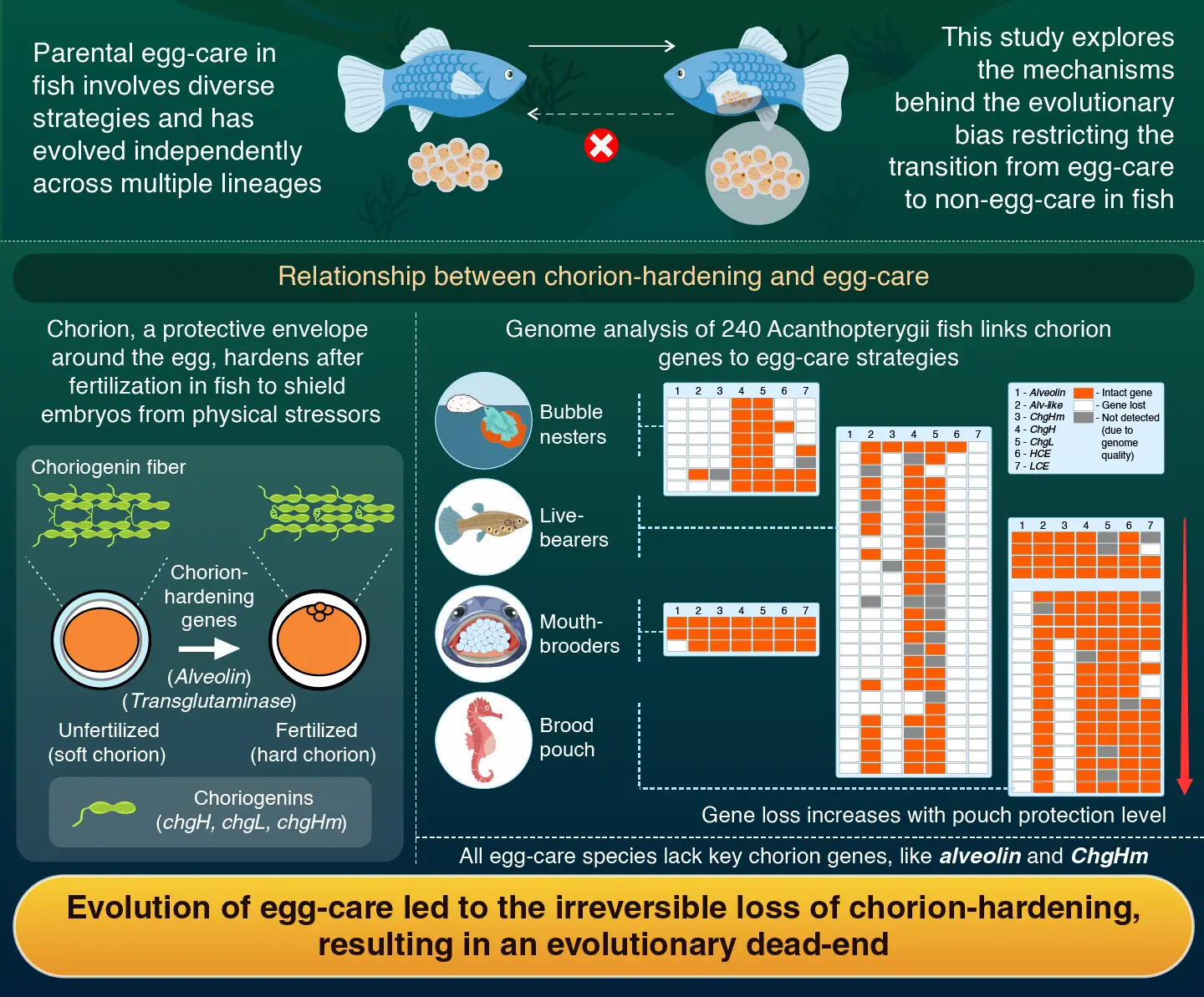 Parental egg-care in fish traps them in an evolutionary dead-end through the loss of the chorion-hardening system, find scientists from the Institute of Science Tokyo. Fish have diverse egg-caring strategies that have independently emerged multiple times across lineages. Comparative whole genome analysis of 240 fish species revealed a strong correlation between loss of the chorion-hardening system and parental egg-care, revealing the mechanisms behind the evolutionary bias that restricts egg-caring fish from becoming non-egg-carers.