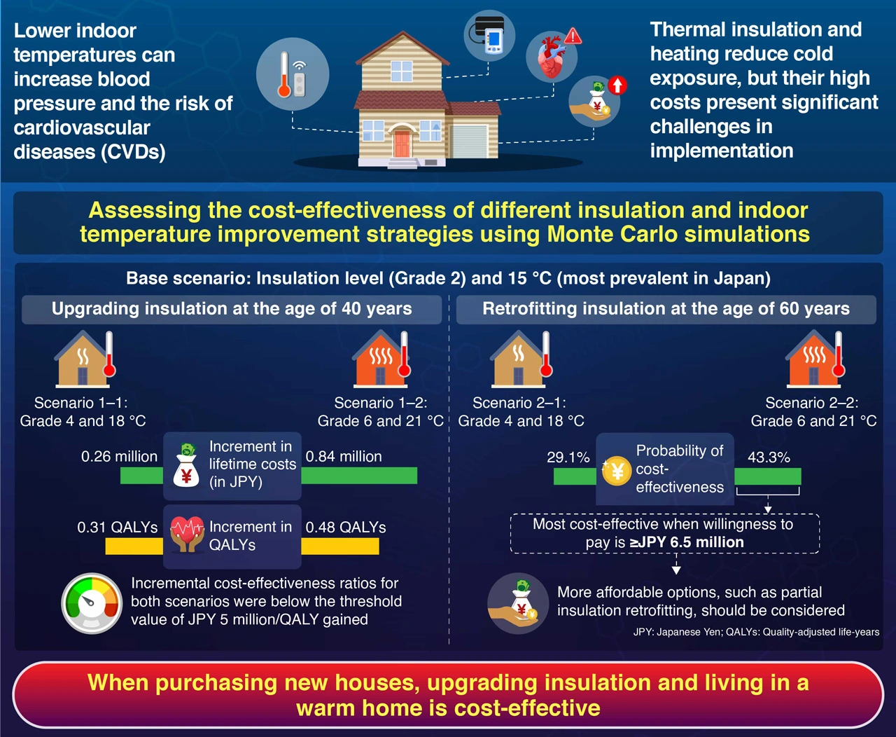 Lower indoor home temperatures are associated with a higher prevalence of cardiovascular diseases. A recent study by Institute of Science Tokyo (Science Tokyo) reports that upgrading thermal insulation in new homes is more cost-effective than retrofitting insulation to existing homes in Japan. This finding could help guide policymakers in subsidizing housing costs to create warmer homes, thus reducing cold-induced hypertension and cardiovascular diseases.