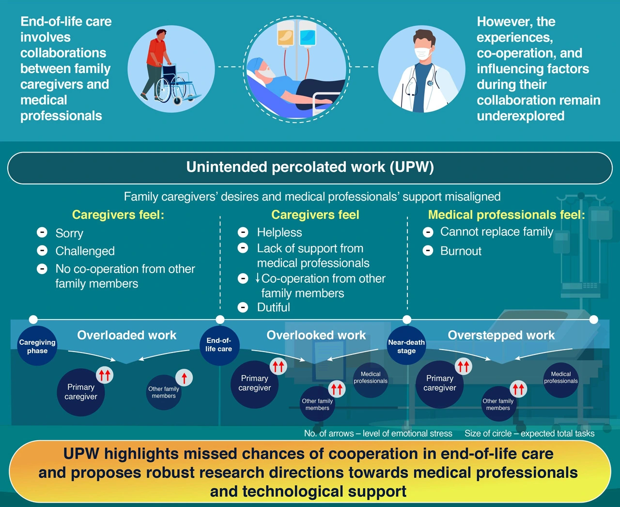 Semi-structured interviews conducted with bereaved family caregivers and healthcare professionals involved in end-of-life care show that family caregivers’ desires and healthcare professionals’ support are misaligned, leading to unintended, percolated work. Scientists investigated family caregivers’ experiences during their care journeys, and the factors affecting cooperative activities between caregivers and medical professionals to understand the importance of collaboration in end-of-life care. Their findings propose potential research trajectory towards medical professional and technological support.