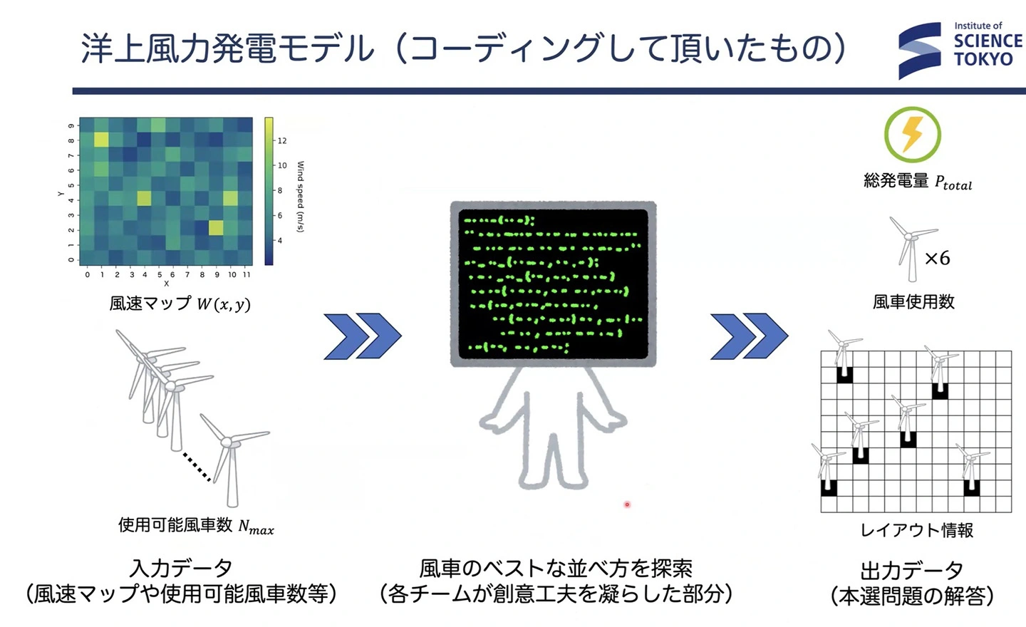 The main question in this year’s finals focused on offshore wind power generation, challenging participants to determine the optimal turbine layout for maximizing total power generation. Contestants worked tirelessly to achieve high-speed solutions leveraging the unique characteristics of the graphic processing units in TSUBAME4.0.