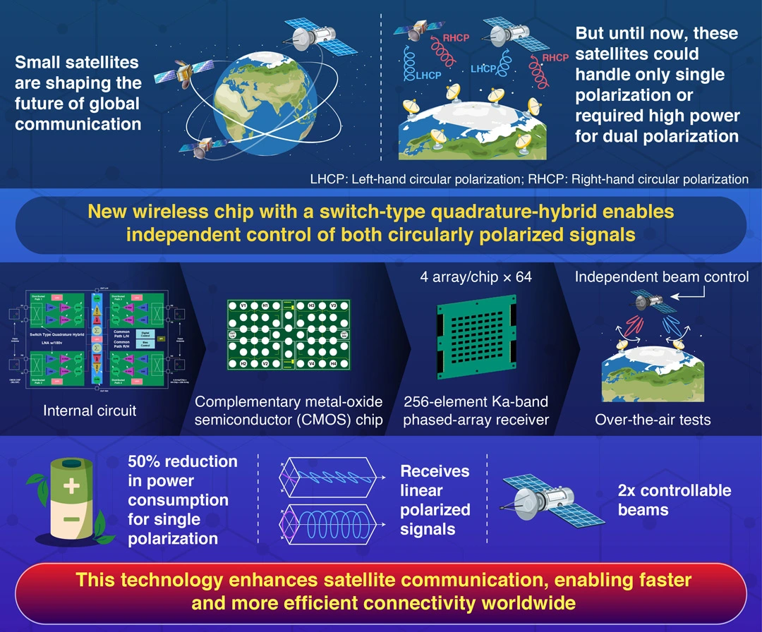 A first-of-its-kind 256-element Ka-band phased-array receiver, designed at Institute of Science Tokyo, Japan, can control two circular polarization beams independently, revolutionizing satellite communications with greater energy efficiency and better performance. Introduction of a novel switch-type quadrature-hybrid in the CMOS chip of the receiver effectively doubles the number of controllable beams, paving the way for enhanced data throughput and broader satellite coverage.