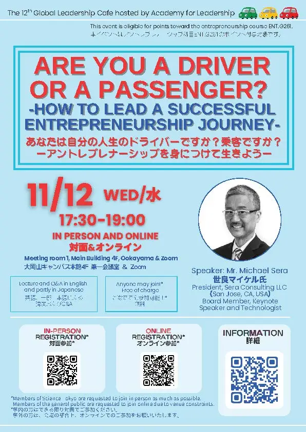 The 12th Global Leadership Cafe Series Lecture and Q&A : “Are you a Passenger or a Driver? -How to Lead a Successful Entrepreneurship Journey-”