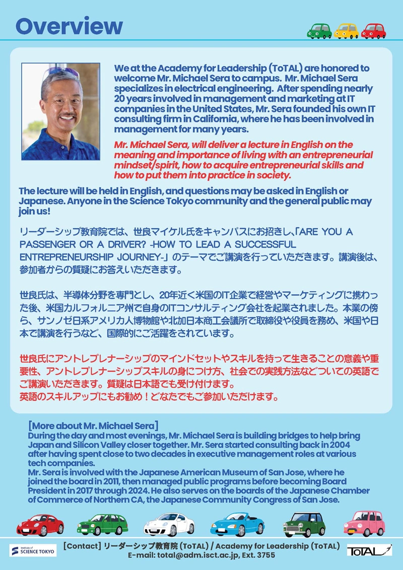 Mr. Sera will give a talk in English on the meaning and importance of living with an entrepreneurial mindset/spirit, how to acquire entrepreneurial skills and how to put them into practice in society. The lecture will be conducted in English, and questions may be asked in Japanese.