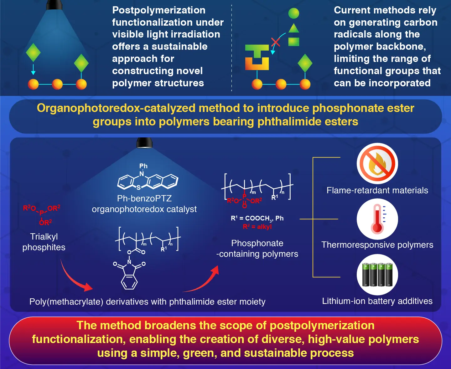 A visible-light-driven postfunctionalization method developed by researchers from Japan enables the incorporation of phosphonate esters into polymers, expanding the possibilities for creating fire-resistant and temperature-responsive materials. This reaction technique offers a sustainable way to add useful functional groups to precursor polymer chains without altering their molecular weight, transforming common polymers into high-value materials that are difficult to obtain through direct polymerization of functional monomers.