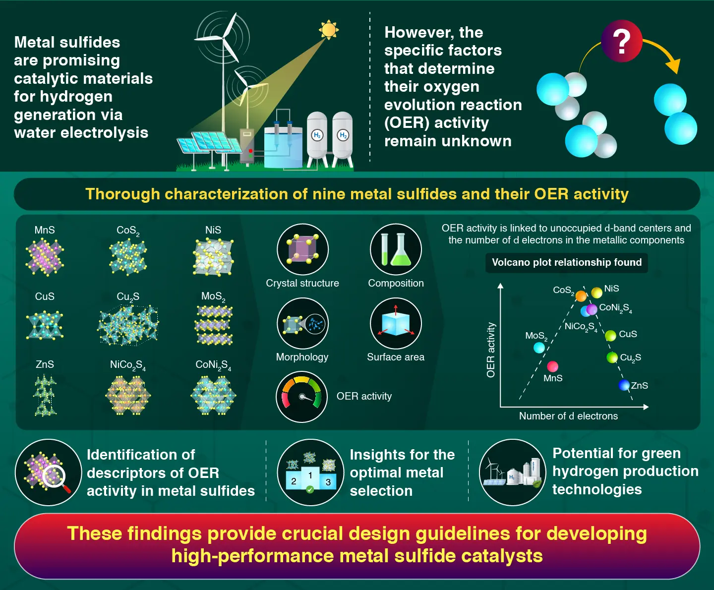 The researchers synthesized metal sulfides containing various metals, including manganese, cobalt, nickel, copper, molybdenum, and zinc, and tested their ability to catalyze the OER. They combined experimental electrochemical measurements with advanced computational analysis to understand why certain materials performed better than others. “We aimed to establish a comprehensive descriptor for the OER electrocatalytic activity of metal sulfides by conducting a systematic investigation to elucidate the main factors influencing the OER,” explains Yamaguchi.