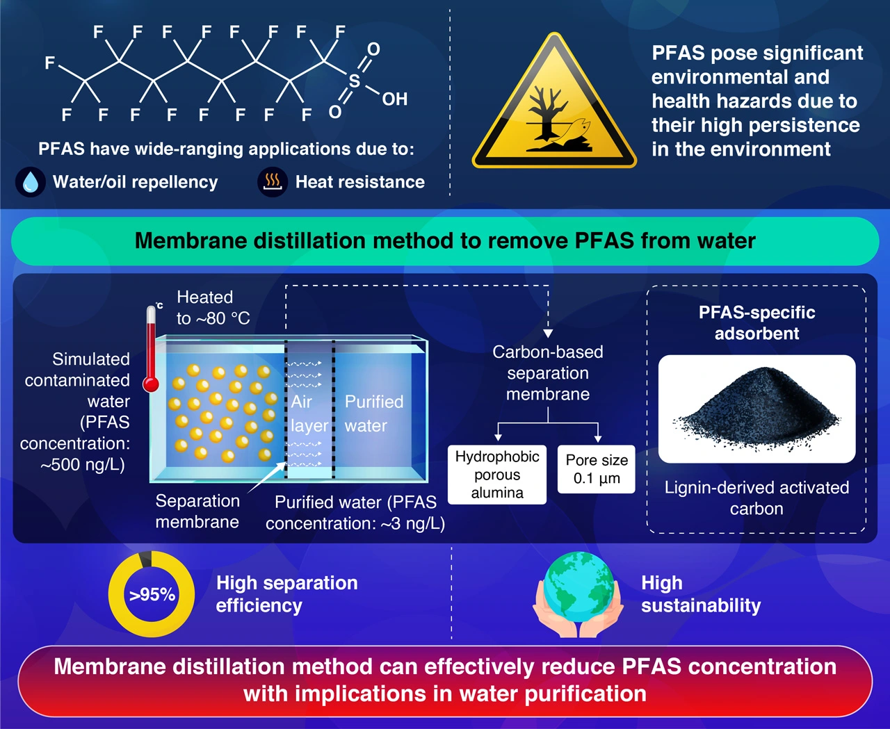 The researchers leveraged the difference in the boiling points between water and PFAS to purify water contaminated with PFAS using the MD method. Additionally, the hydrophobic (lacking affinity for water), porous carbon-based separation membrane effectively rejected PFAS, allowing only water vapor to pass through it. In-depth experimental analysis showed that simulated contaminated water, containing perfluorooctanesulfonic acid (PFOS) at a concentration of around 500 ng/L after MD treatment, had a PFOS concentration of around 3 ng/L, which was below the global environmental standards.