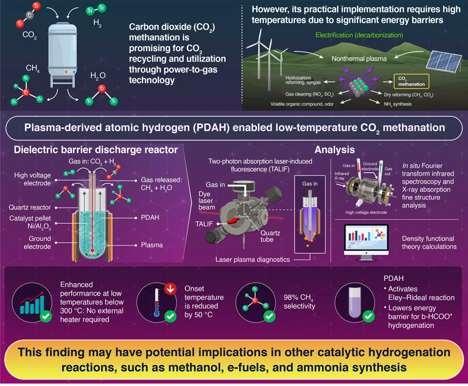 Scientists developed a new method that enables low-temperature carbon dioxide methanation using plasma-derived atomic hydrogen