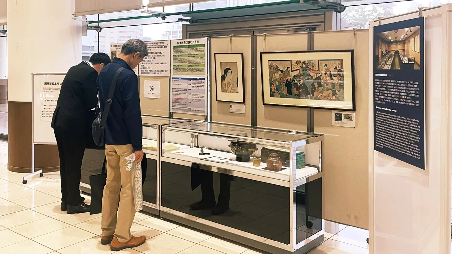Held in the foyer just outside Akio Suzuki Memorial Hall, the exhibition showcased a replica of the Kaitai Shinsho, or New Book on Anatomy, from the Ochanomizu Library, a set of ohaguro tools from the Dental Museum used to blacken teeth for aesthetic, social, and health reasons until the Meiji era, and a replica of the Nobel Prize medal and diploma from the Science Tokyo Museum and Archives. Visitors eagerly inspected the exhibits, particularly enjoying the opportunity to study certain pieces that usually are not available to the public.