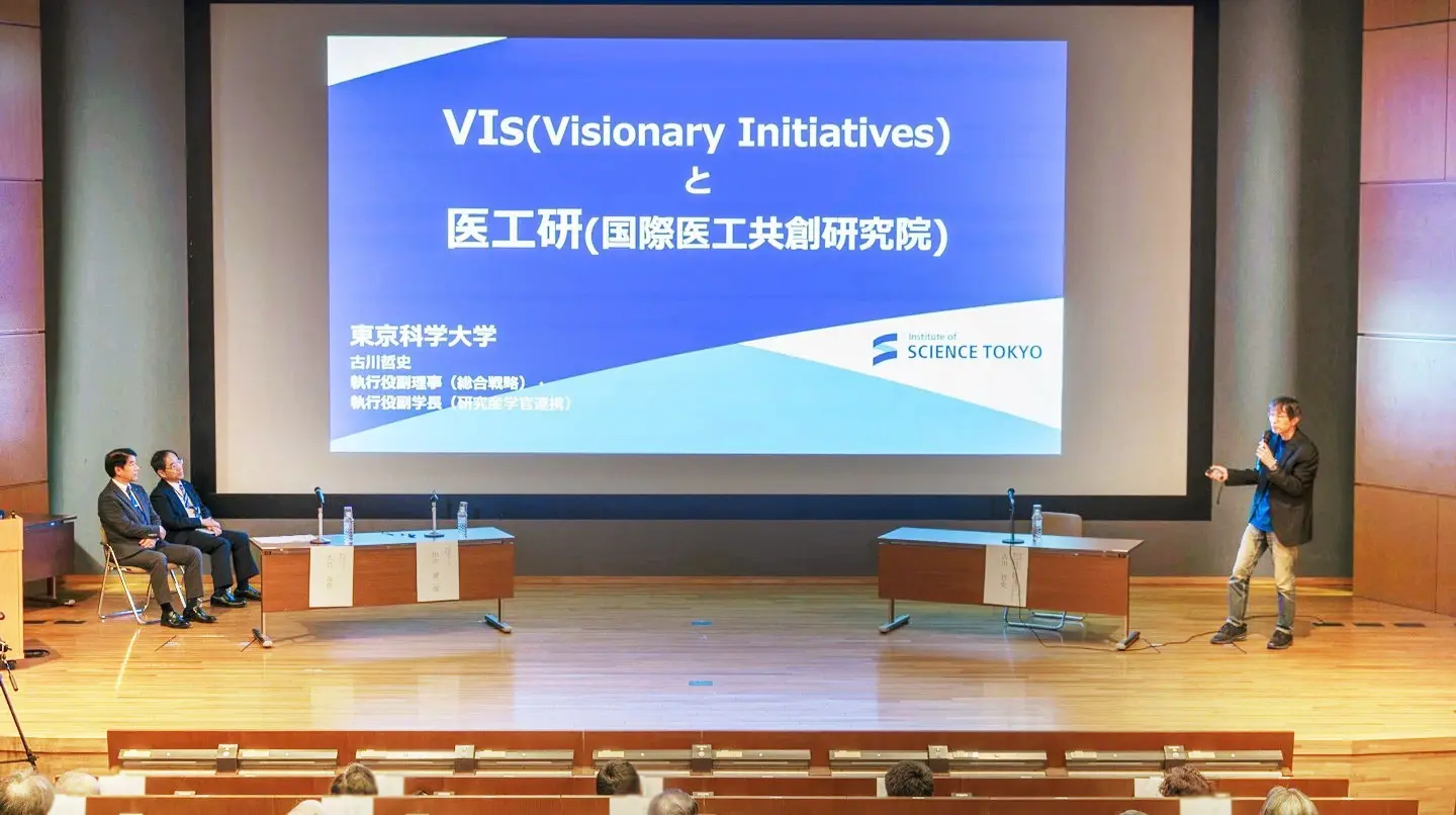 In the second session, President and Chief Executive Officer (CEO) Naoto Ohtake and President and Chief Academic Officer (CAO) Yujiro Tanaka were joined by Executive Vice President for Institute Strategy and Executive Vice President for Research and Industry-Academia-Government Collaboration Tetsushi Furukawa to present a talk on Science Tokyo’s vision and research structure. First, Furukawa described the Visionary Initiatives (VIs), a vision-driven interdisciplinary research framework introduced in April 2025 to guide the Institute’s efforts toward realizing a better, brighter future, and introduced the new Institute of Biomedical Engineering (BME), established on July 1, 2025. Ohtake and Tanaka rounded out the session with an in-depth look into the vision of the future for the new Science Tokyo.