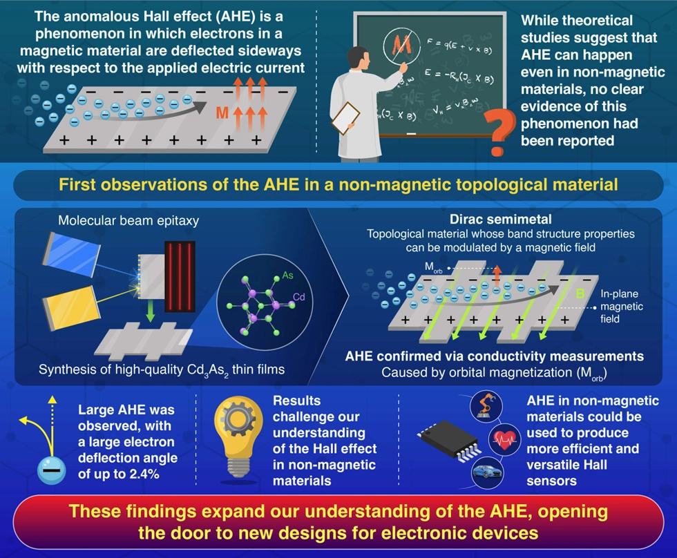 Using molecular beam epitaxy, the team produced high-quality Cd3As2 thin films, a Dirac semimetal with the necessary symmetries. They applied an in-plane magnetic field to these films and measured the Hall conductivity of the material. Based on the changes in this conductivity in response to variations in the applied magnetic field, the researchers could infer the magnitude of the induced AHE. Surprisingly, the team managed to induce a giant AHE with this setup. Detailed analysis of the experimental results suggested that this effect originated from orbital magnetization—that is, magnetization due to the orbital motion of electrons rather than their spin.