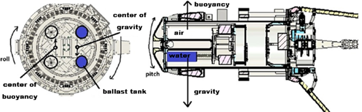 Ballast tanks are devices that adjust buoyancy by taking in external water into the body. Because it utilizes buoyancy, the robot can efficiently perform downward and upward movements compared to thrusters.