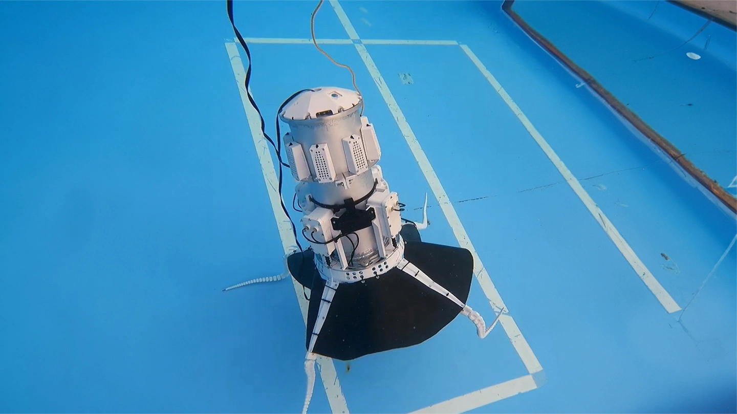 Another strength is its ability to generate propulsion by scooping water with the membrane. For instance, in environments like ponds where using thrusters is difficult due to algae or sediment, it can opt for membrane-only movement, allowing selection of the most suitable locomotion method for the environment.