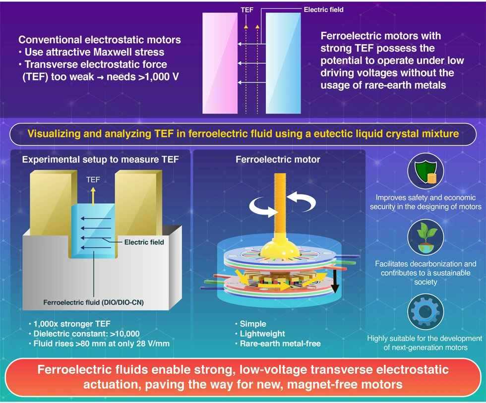 Researchers have discovered that ferroelectric fluids can harness an overlooked transverse electrostatic force (TEF) to rise over 80 mm, without magnets or high voltages. By exploiting the fluid’s spontaneous polarization and exceptionally high dielectric constant, they achieved a strong TEF, previously thought unattainable in conventional electrostatics. This breakthrough enables creation of a lightweight, magnet-free motor, opening possibilities for compact, energy-efficient actuators and suggesting a transformative approach to converting electrical energy into mechanical motion at low voltages.