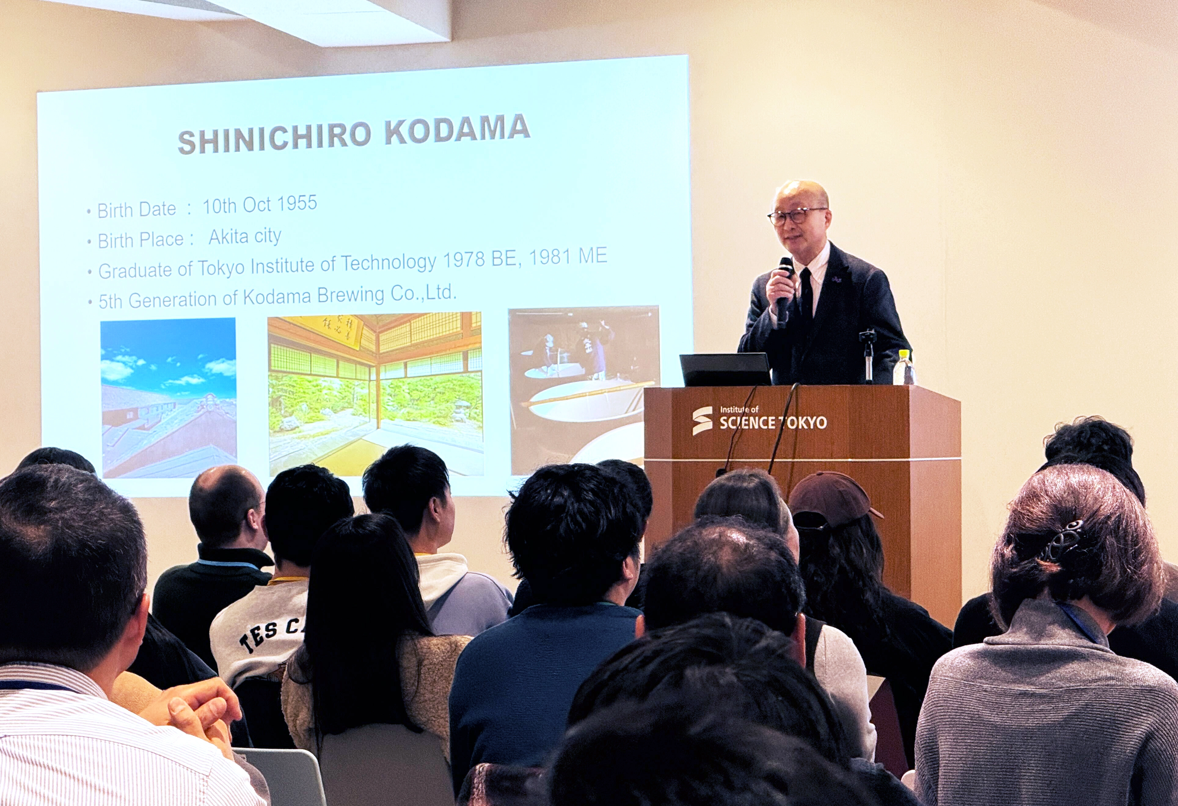 The event featured Mr. Shinichiro Kodama of Kodama Brewing Co., Ltd. (Akita Prefecture), who is also an alumnus of the university. He delivered a lecture in English titled "SAKE BREWING FOCUSING ON YEAST." Mr. Kodama introduced the history of the brewery and the sake-making process through slides and videos, followed by an explanation of three major discoveries regarding yeast: non-foaming yeast, cerulenin-resistant yeast, and urea-free yeast. He highlighted specific applications for international export, flavor enhancement, and safety improvements, which drew significant interest from the audience.