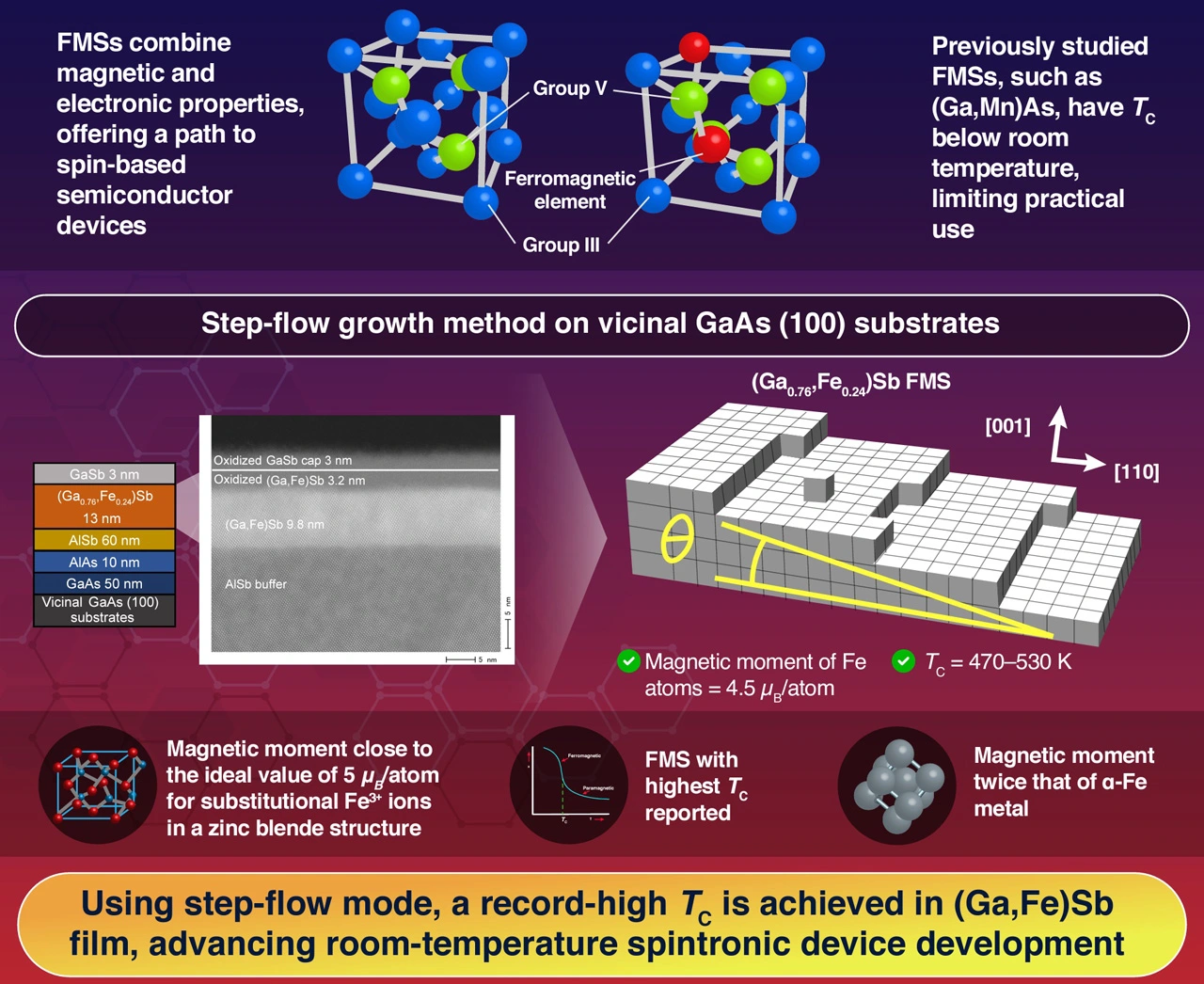Researchers utilize the step-flow growth method to develop high-quality (Ga,Fe)Sb ferromagnetic semiconductor with a record-high Curie temperature for spintronics
