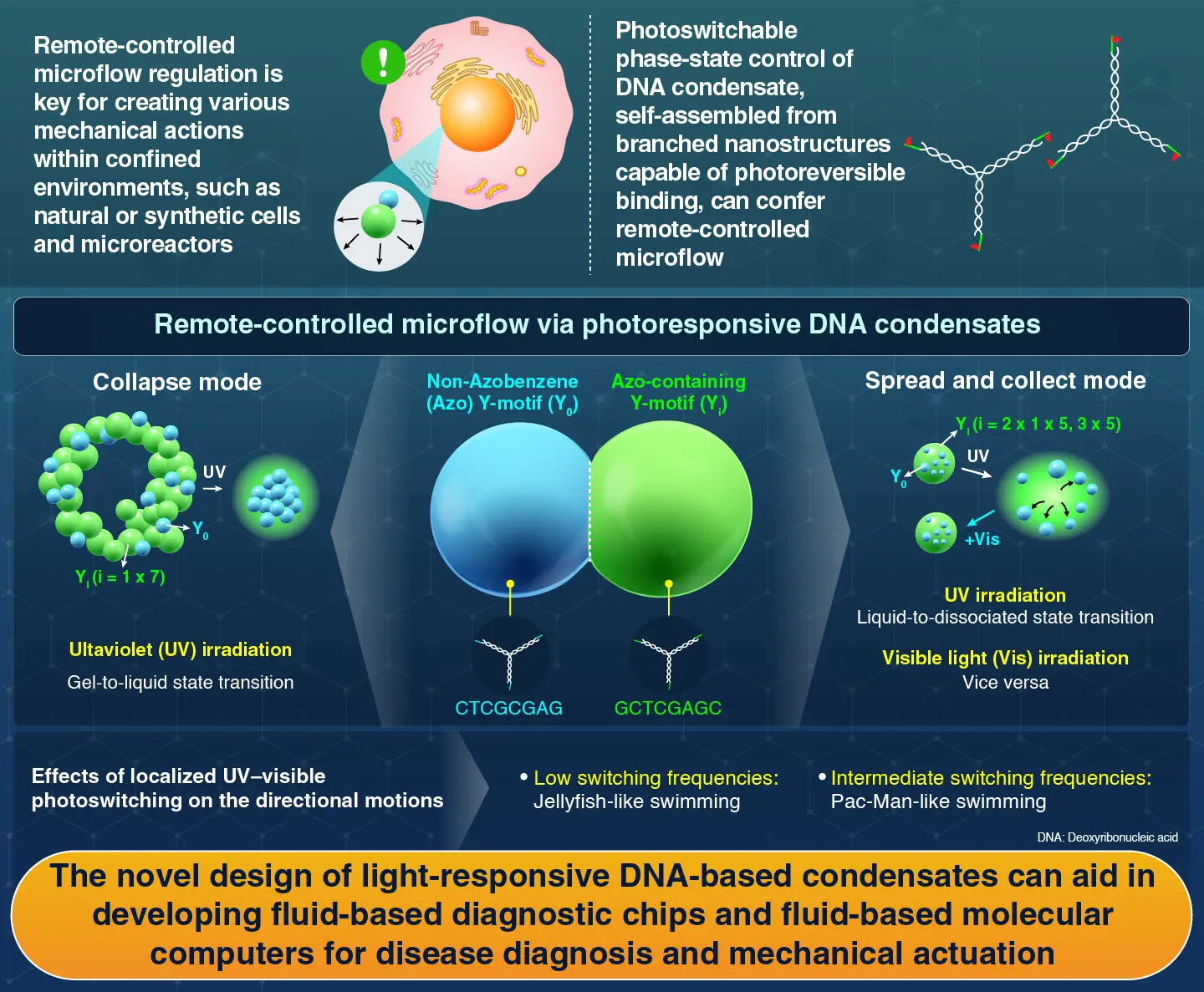 Remote-controlled microflow using light-controlled state transitions within DNA condensates has been reported by scientists from Institute of Science Tokyo, Japan. By switching between ultraviolet light (UV) and visible light irradiation, the researchers demonstrated that the novel DNA motifs containing azobenzene can dissociate or reassemble. Furthermore, localized photo-switching within a DNA liquid condensate generated two distinct directional motions. This study can fuel the development of innovative fluid-based diagnostic chips and molecular computers.