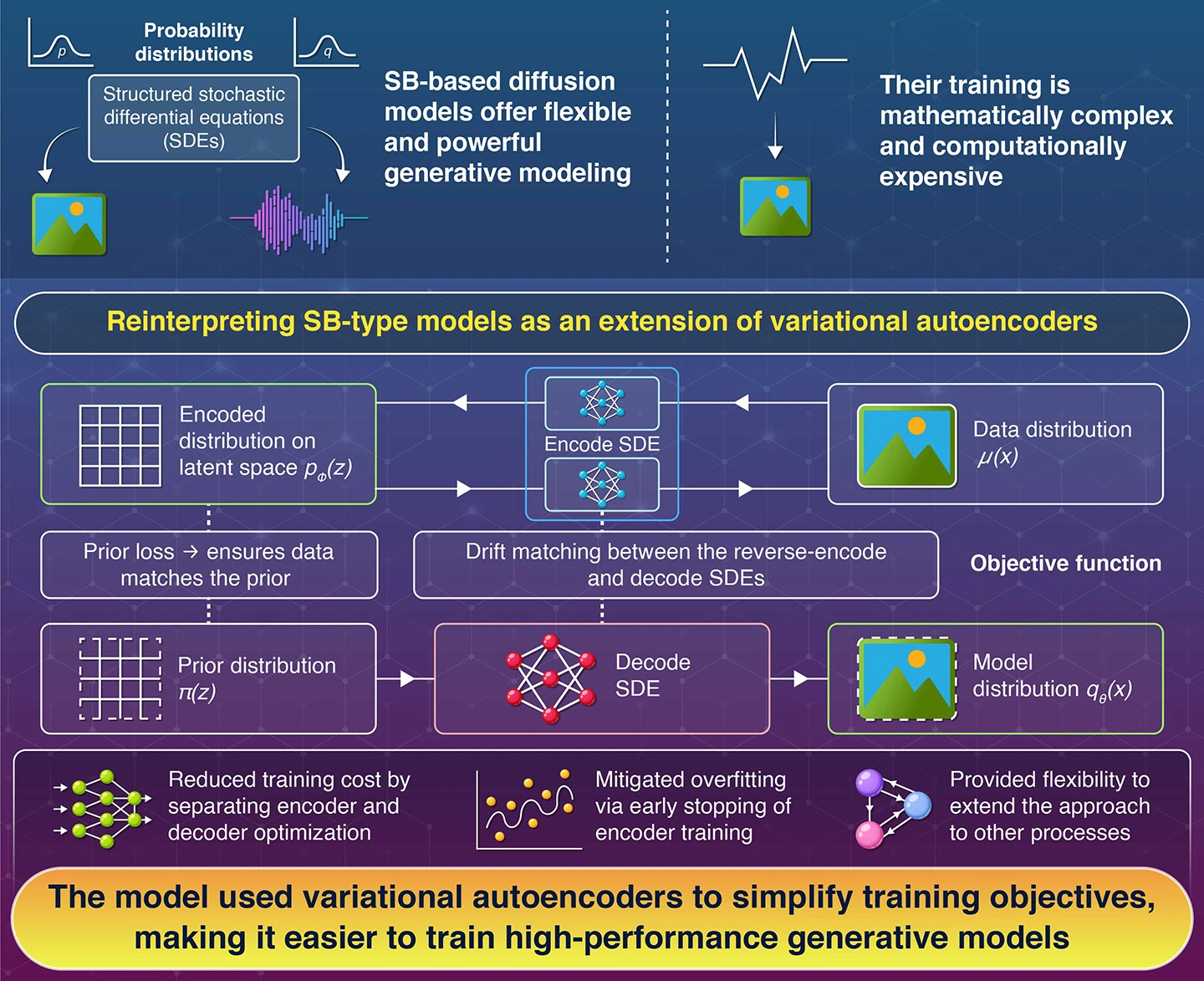 A new framework for generative diffusion models was developed by researchers at Science Tokyo, significantly improving generative AI models. The method reinterpreted Schrödinger bridge models as variational autoencoders with infinitely many latent variables, reducing computational costs and preventing overfitting. By appropriately interrupting the training of the encoder, this approach enabled development of more efficient generative AI, with broad applicability beyond standard diffusion models.