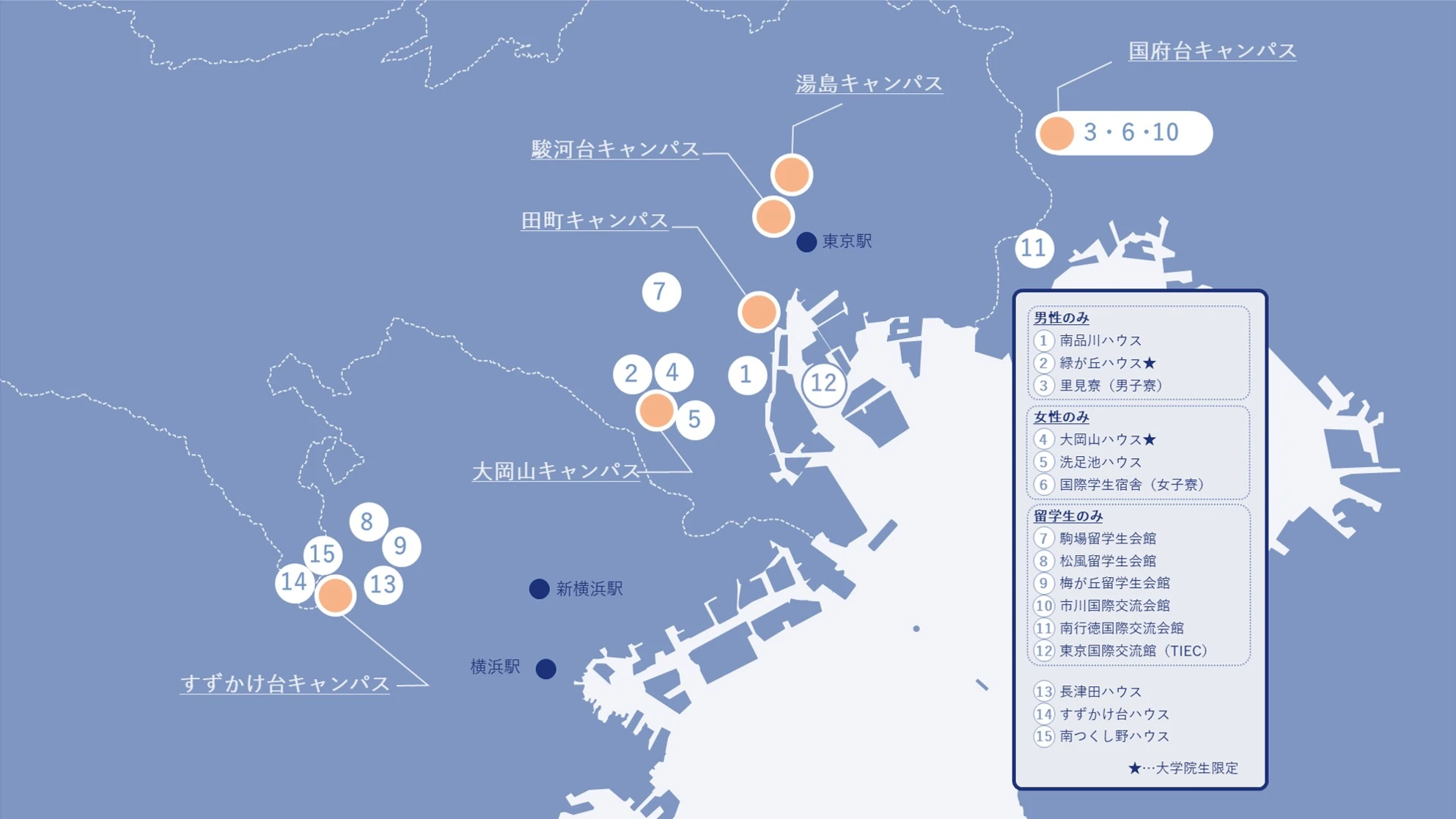| 番号 | 寮名 | 推奨キャンパス | 性別 | 課程/国籍 | 部屋タイプ |