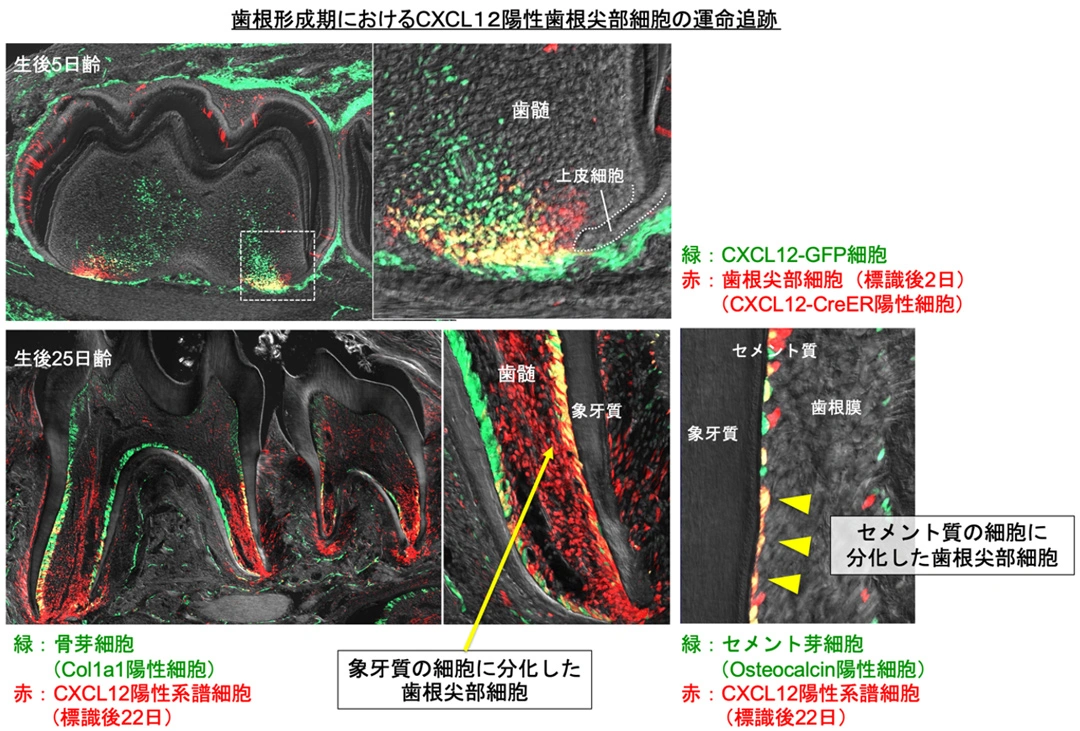 - 健康な歯の維持に不可欠な歯根や歯槽骨は、幹細胞が形成に関与すると考えられてきましたが、生体内における幹細胞の正確な局在や働きは不明でした。