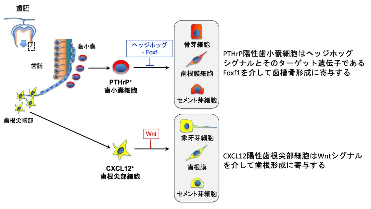 歯小嚢に存在するPTHrP陽性の間葉系細胞が、ヘッジホッグ-Foxfシグナルを介して歯槽骨の形成に寄与すること、また歯根尖部に存在するCXCL12陽性の間葉系細胞が、Wntシグナルを介して歯根形成に重要な役割を果たすことを、細胞系譜追跡により明らかにした。
