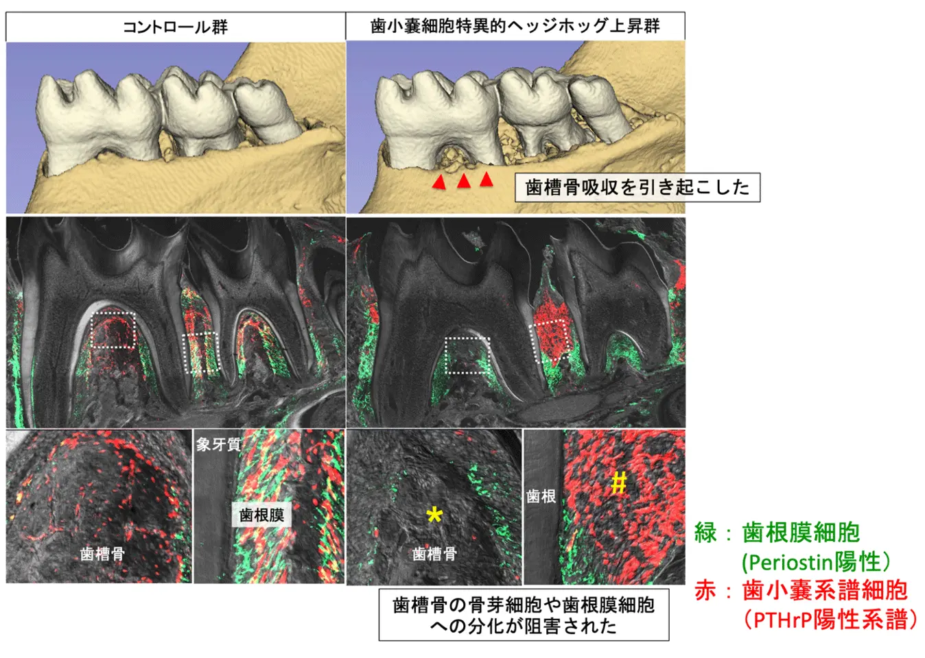 歯小嚢細胞特異的にヘッジホッグシグナルを上昇させると、マウス臼歯周囲の歯槽骨吸収を引き起こした(図上段)。また通常、歯小嚢細胞は骨芽細胞や歯根膜細胞へと分化するが、ヘッジホッグシグナル上昇群では歯小嚢細胞は骨芽細胞やPeriostin陽性歯根膜細胞に分化が阻害された(中段・下段)