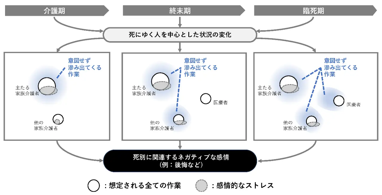 - 終末期ケアの中で、家族介護者が意図せず担うことになった役割や作業、そしてそれに伴って生じる感情的ストレスのことを「意図せず、滲み出てくる作業」と定義。