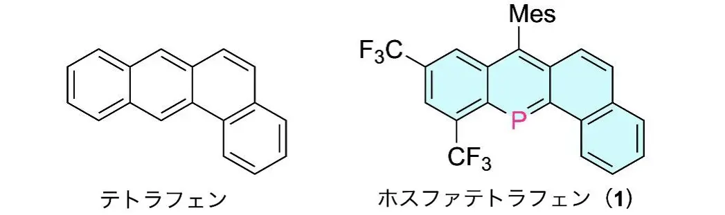 アントラセンは3個のベンゼン環が融合した分子で、多環芳香族炭化水素(PAH)[用語3]の一例です。PAHにはペンタセンのように優れた機能性を示す例が多いことを踏まえ、筆者らはさらにサイズの大きいPAHのリン類縁体の合成研究を試み、図2に示すような、テトラフェンのリン類縁体であるホスファテトラフェン1を単離可能な状態として合成しました。分子内に含まれるP=C二重結合はほぼ無極性で、C=C二重結合に近い性質を示すことが知られています。このようなPAHの高周期類縁体ではバンドギャップが小さくなることが知られており、特徴的な電子機能だけでなく、活性酸素種などのラジカルを効率よく捕捉する性質が期待されます。また、ラジカルを捕捉して生成する常磁性分子には、電子スピンと核スピンと組み合わせて量子コンピューター計算を実行できる可能性なども考えられます。