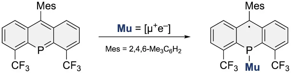ミュオンと有機化合物の反応について、具体的な事例を図1に示します。この事例は筆者らが以前のプレスリリースで紹介したホスファアントラセンの素粒子ラジカル反応で、リン原子に位置選択的にミュオニウムが付加して1種類の常磁性分子が生成することをミュオンスピン回転・共鳴(µSR)測定実験と密度汎関数法(DFT)[用語2]計算によって、同定しました※。このとき、ホスファアントラセン構造を安定化するために導入したトリフルオロメチル(CF3)基が引き起こす分子ひずみがミュオンの同位体効果によって解消され、3個の環から成る分子は元々の平面構造を保った、高エネルギー状態となることが分かりました。また、この常磁性ミュオニウム付加体のµSR観測では、0.16 M(1 M = 1 mol/L)程度のホスファアントラセン溶液試料を用いて行っていますが、これよりも希薄濃度の試料を用いると常磁性ミュオニウム付加体は観測されなくなりました。一般的に有機分子の溶液試料を用いてµSRでミュオニウム付加体を観測する場合、0.5 M程度の濃度が望ましいとされているため、ホスファアントラセンのµSR測定で用いた溶液試料の濃度は比較的低かったと言えます。