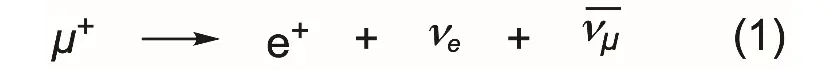 - ミュオンスピン回転・共鳴(µSR)測定実験:ミュオンの平均寿命は2.2マイクロ秒であるが、ミュオンが崩壊すると式1の反応によって陽電子(e+)と2種類のニュートリノ(ν)が生成する。ここで生成する陽電子を観測することで、元々完全にスピン偏極していたミュオンの変化が明らかとなり、物質の構造や性質を解析することができる。