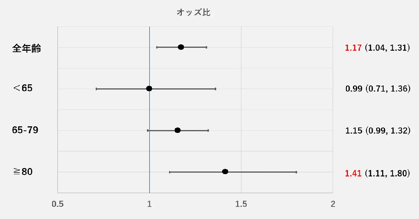 解析の結果、地方の病院で手術を受けた患者は、都市部の病院と比較して、術後90日以内の院内死亡リスクが17%有意に高いことが示されました(95%信頼区間:4%〜31%)。さらに年齢層別に解析したところ、80歳以上の患者では地域差がより顕著であり、都市部に対する地方のオッズ比は1.41(95%信頼区間:1.11〜1.80)と有意に上昇していました(図1)。