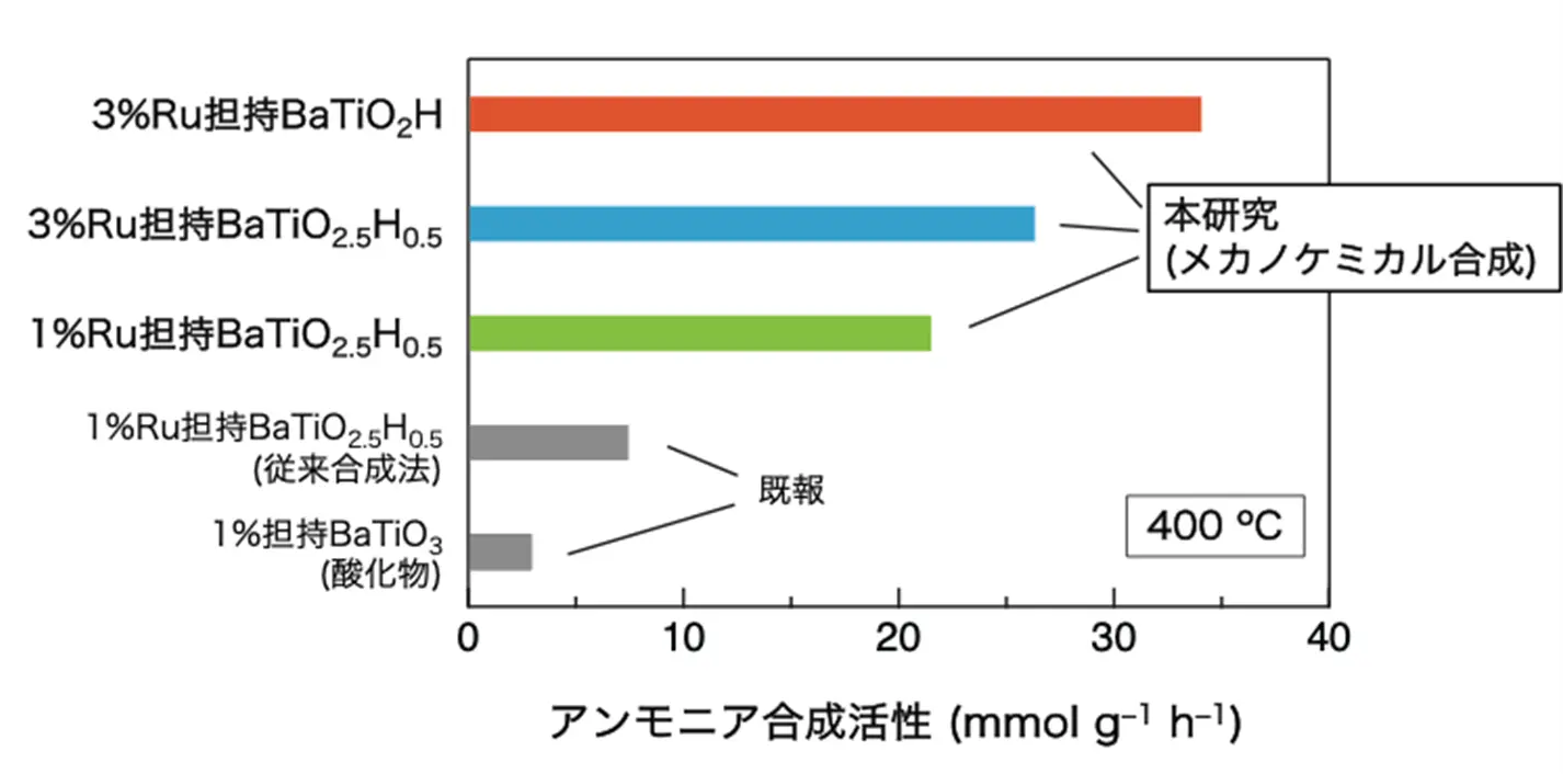 メカノケミカル合成によって得られたBaTiO3–xHx(x=0.5、1)にルテニウム金属(Ru)を担持した(付着させた)触媒材料のアンモニア合成触媒活性(反応温度:400ºC、圧力:0.9メガパスカル(約9気圧))。従来のイオン交換法で得られたBaTiO2.5H0.5や酸化物BaTiO3と比較して高い活性を示す。