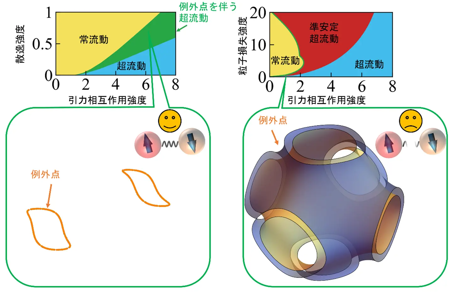 具体的には、スピン対破壊効果を導入した引力ハバード模型[用語7]を解析しました。その結果、これまでは超流動が破壊される境界でのみ現れると考えられていた例外点が、安定な超流動を伴って量子相内部に出現することを初めて理論的に示しました(図2)。この成果は、例外点は超流動を壊すという従来の理解を覆すものです。さらに、エネルギーが複素の値をとる非エルミート系特有の性質を反映したエネルギー構造を用いて、超流動における例外点が出る条件を明確にし、その背後にあるメカニズムを解明しました。