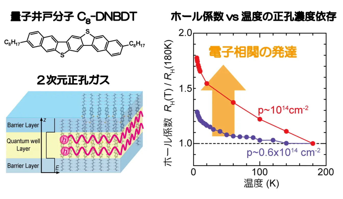 - 有機半導体に高密度に電荷を注入していくと、絶縁体から金属に転移し、さらに電子相関効果が発達していく様子を初めて観測しました。