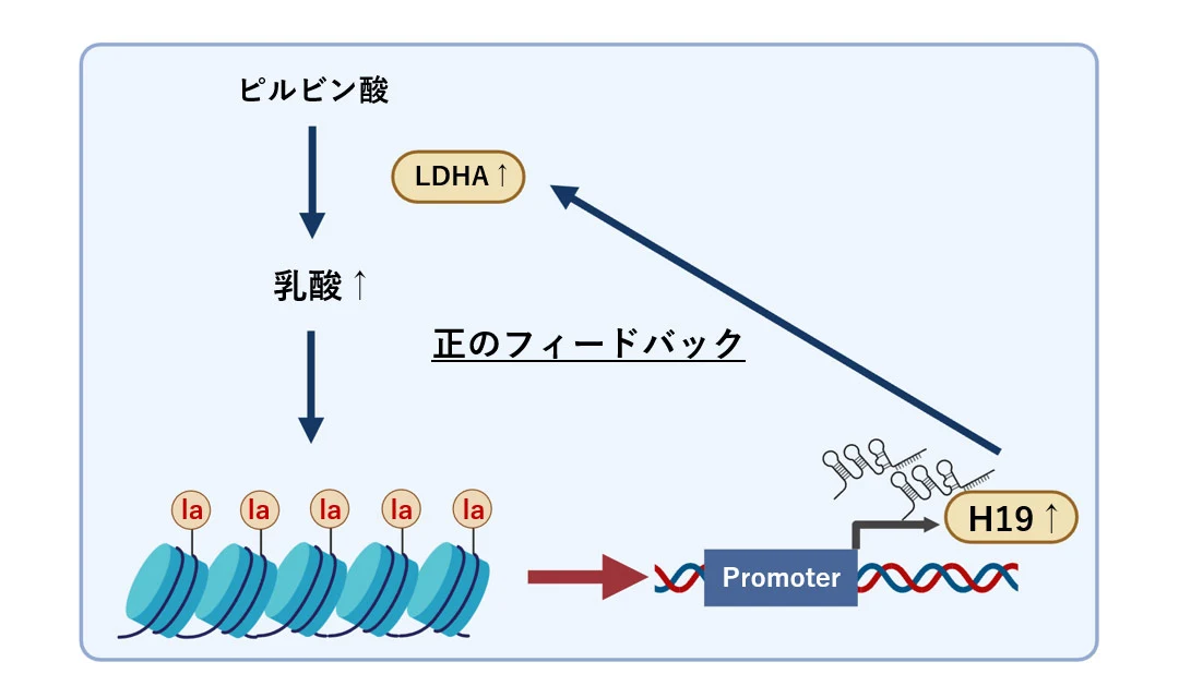 さらにヒストンラクチル化レベルの亢進が、長鎖ノンコーディングRNA[用語4]の一つであるH19の発現を上昇させ、それを介してがん特有の解糖代謝(Warburg効果[用語5])を亢進させ、この代謝亢進がさらにヒストンラクチル化を加速させるフィードバックループ機構を形成し、がんの増殖・悪性化が進行していることが示唆されました。
