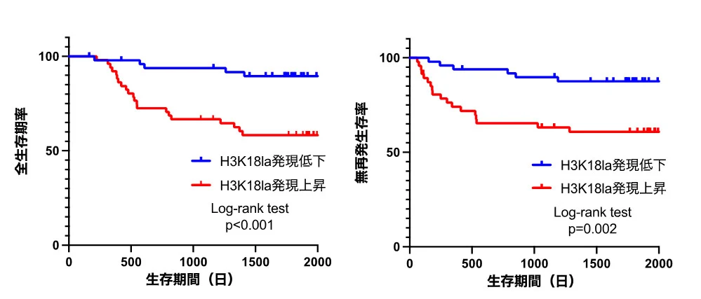 H3K18la高発現胃がん症例では全生存期間(左)、無再発生存期間(右)が短く、予後が悪い。
