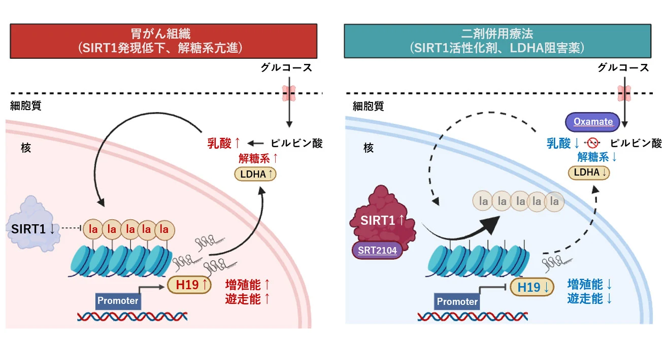 さらに、ヒト胃がん細胞においてH19発現を抑制すると、LDHA遺伝子(乳酸脱水素酵素A)の発現抑制を介して解糖系が抑制され、ヒストンラクチル化レベルの低下が認められました。また、胃がん組織では正常組織と比較してSIRT1の発現が有意に低下していることが確認されました。SIRT1発現低下はヒストンラクチル化レベル上昇を招く原因となり、H19遺伝子のエピジェネティックな発現増加を通じて解糖系が亢進し、ヒストンラクチル化レベルがさらに上昇するポジティブフィードバックループ機構が明らかになりました(図4)。