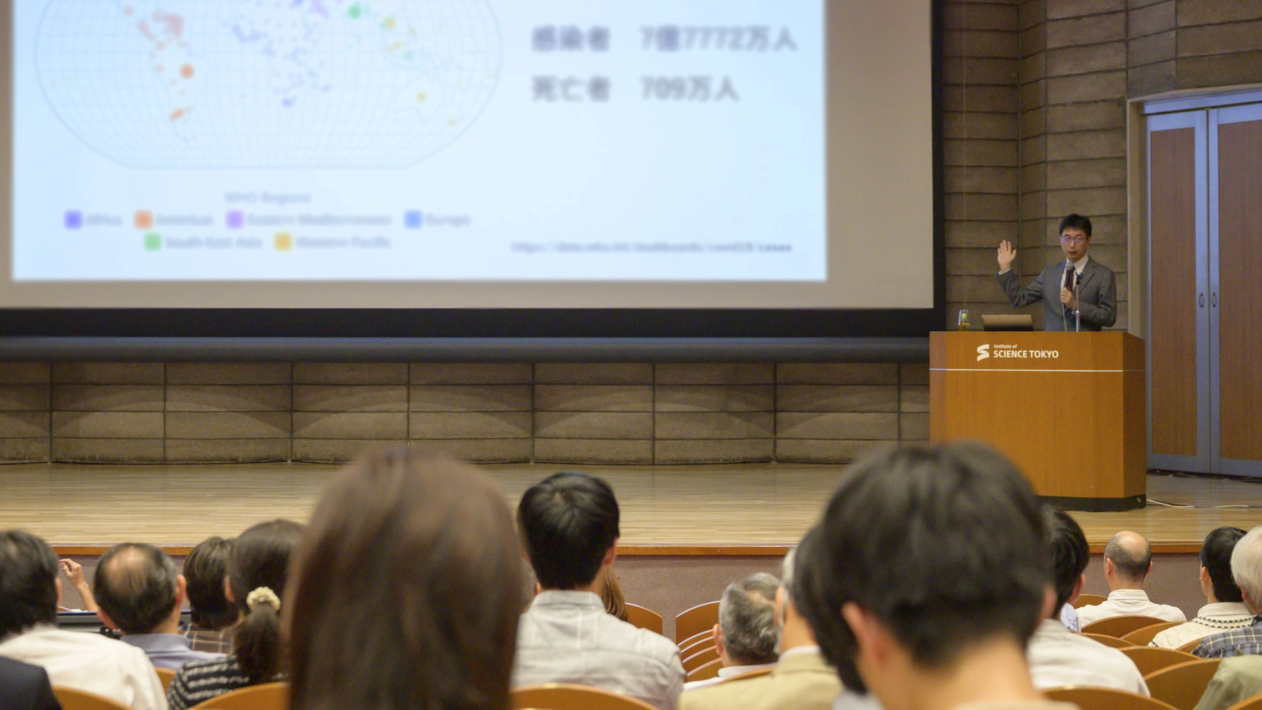 15時からは、70周年記念講堂で大学主催イベントである「Science Tokyo Meeting」を実施しました。オープニングでは海外在住の卒業生から寄せられたメッセージ動画の上映を行い、第1部の基調講演では、東京科学大学感染症センター(TCIDEA)のセンター長である具芳明教授が登壇しました。