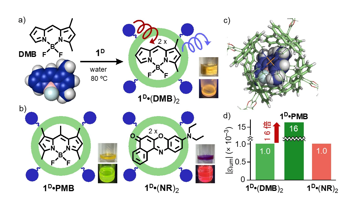 次に、キラル性能を持たない色素分子をらせん型カプセルに内包することで、分子間相互作用により、色素分子にキラル蛍光物性を誘起することに成功しました。ホウ素を含む高蛍光性の色素分子DMBを水中でカプセル1Dと加熱・撹拌すると、効果的な相互作用によって、1Dが2分子のDMBを内包した1D•(DMB)2を定量的に生成しました(図3a)。その構造はNMR、MSおよび紫外可視吸収(UV-vis)分析によって確認しました。溶液は黄色を示し、UV-visスペクトルでは、内包されたDMBに由来する吸収バンドが 430~600 nmに観測されました。CDスペクトルで同領域に明確なバンドが見られたことから、DMBへのキラル伝達を確認しました。本来キラル性能を持たない色素分子がカプセルのキラル空間に入ることで、その分子配座にキラル性能が発現したと考えられます。また、内包体1D•(DMB)2は蛍光性を持ち、450 nmの光照射で色素分子に由来する黄色蛍光(490~650 nm)を発し、その円偏光発光(CPL)スペクトル[用語6]で同領域にバンドが観測されました。逆巻きのらせんカプセルの内包体1L•(DMB)2は、正負がほぼ反転したCPLスペクトルを示しました。そのキラル蛍光物性の|glum|値は0.001でした(図3d)。次に、かさ高い類似の色素分子PMBおよび異なる色素分子NRを1Dで内包した1D•PMBと1D•(NR)2の水溶液を同様の方法で作成しました(図3b)。注目すべきことに、緑色蛍光を発する1D•PMBは、500~680 nmに強いCPLバンドを示し、|glum|値は0.016まで大きく向上しました。その理由は、大きさの適合によりカプセル内での色素分子の動きが抑制されたことに起因します(図3c)。このキラル蛍光物性は、分子空間を活用した過去の例と比較してほぼ最高値です。また、紫色水溶液の1D•(NR)2は赤色のキラル蛍光物性(|glum| = 0.001)を発現し、このらせん型カプセルはさまざまな色素分子に適用できることが明らかになりました。