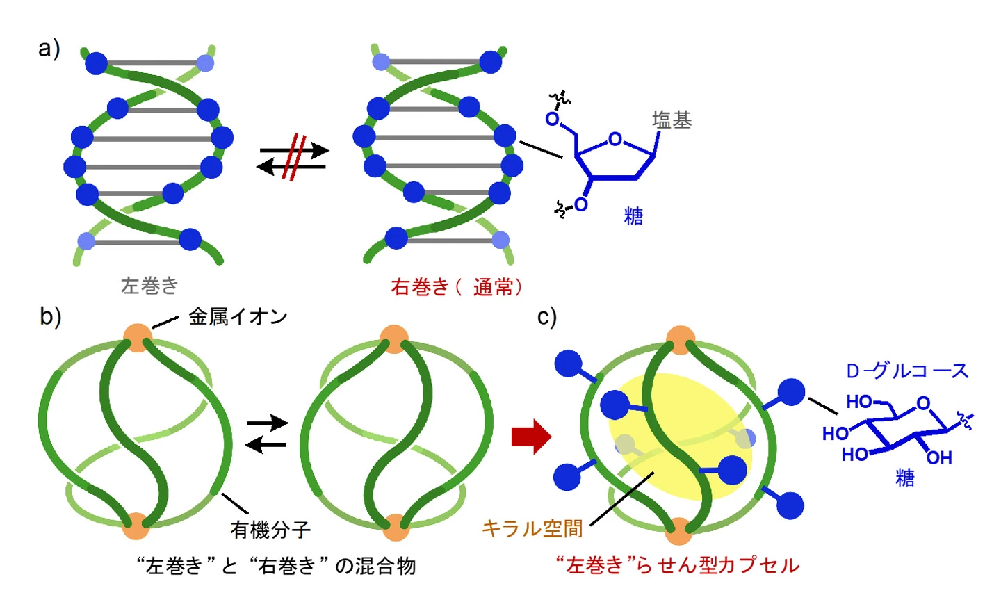 「らせん」は、DNAやタンパク質などに見られる重要な生体構造です。遺伝情報をつかさどるDNAは、2重らせんの主鎖に組み込まれた単糖(デオキシ-D-リボース)のキラル骨格に起因して、“右巻き”のらせん構造のみを形成します(図1a)[参考文献1]。その鏡像の“左巻き”らせんは通常の生体条件では形成しません。このような生体のらせん構造を模倣して、化学合成する試みが盛んに行われてきました。1987年にJ.-M. Lehn[用語4](同年にノーベル化学賞を受賞)らは、ひも状の有機分子を金属イオンで集合させることで、“人工2重らせん”の合成に初成功しました[参考文献2]。その後、3重や4重などのさまざまならせん構造体が合成され続けています。しかしながら、それらのらせん構造体の大部分は、右巻きと左巻きの混合物として存在し(図1b)、巻き方向を制御することは困難とされています。らせん制御の例は幾つかあるものの、その主鎖骨格にキラル部位を導入する必要があるため、合成は困難でした。また、得られた人工らせん構造体の“内部空間”の性質や活用はほぼ未開発でした。