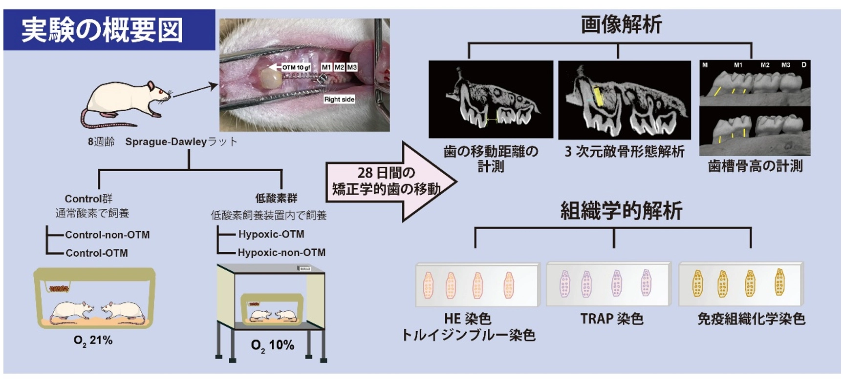 - ラットを用いた実験により、全身的かつ持続的な低酸素環境が、歯の移動効率や歯周組織のリモデリングに与える影響を明らかにしました。