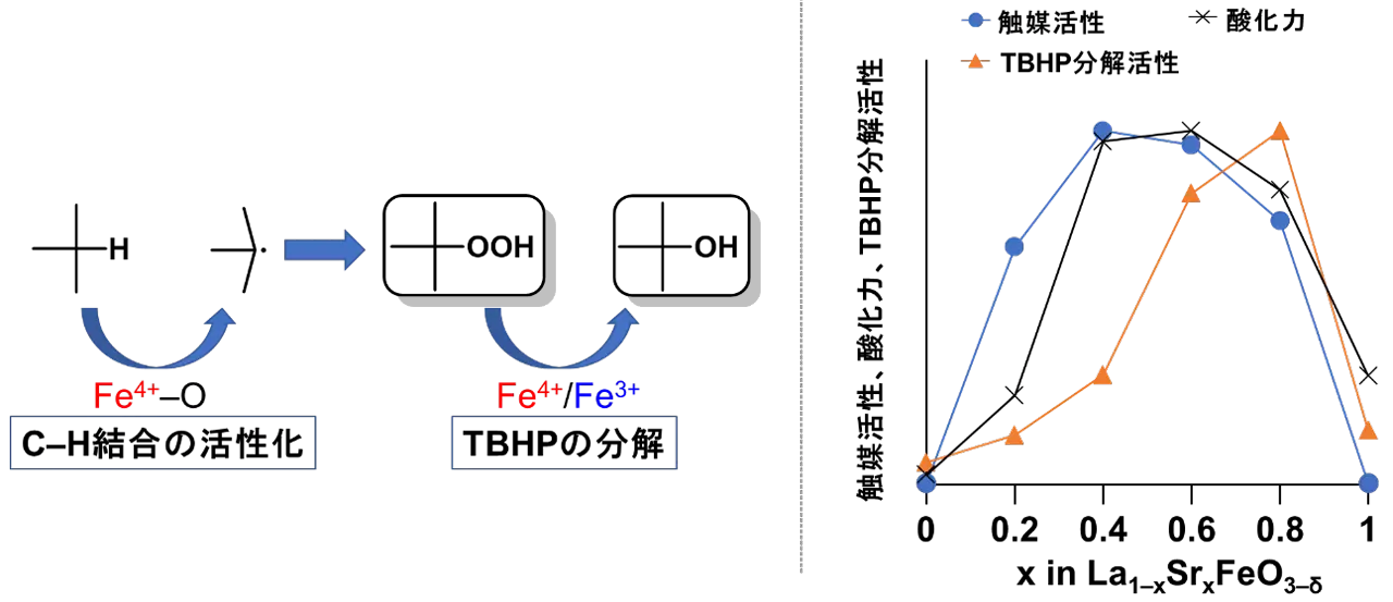 この触媒の反応機構を検討したところ、ペロブスカイト酸化物中のFe4+–O種がC-H結合のラジカル的活性化に重要な役割を果たしていることが明らかになりました(図3)。また、La1–xSrxFeO3–δのSr量依存性より、触媒の酸化特性と中間体TBHPの分解特性には、Fe4+とFe3+が混在する状態が有効であることが分かりました。