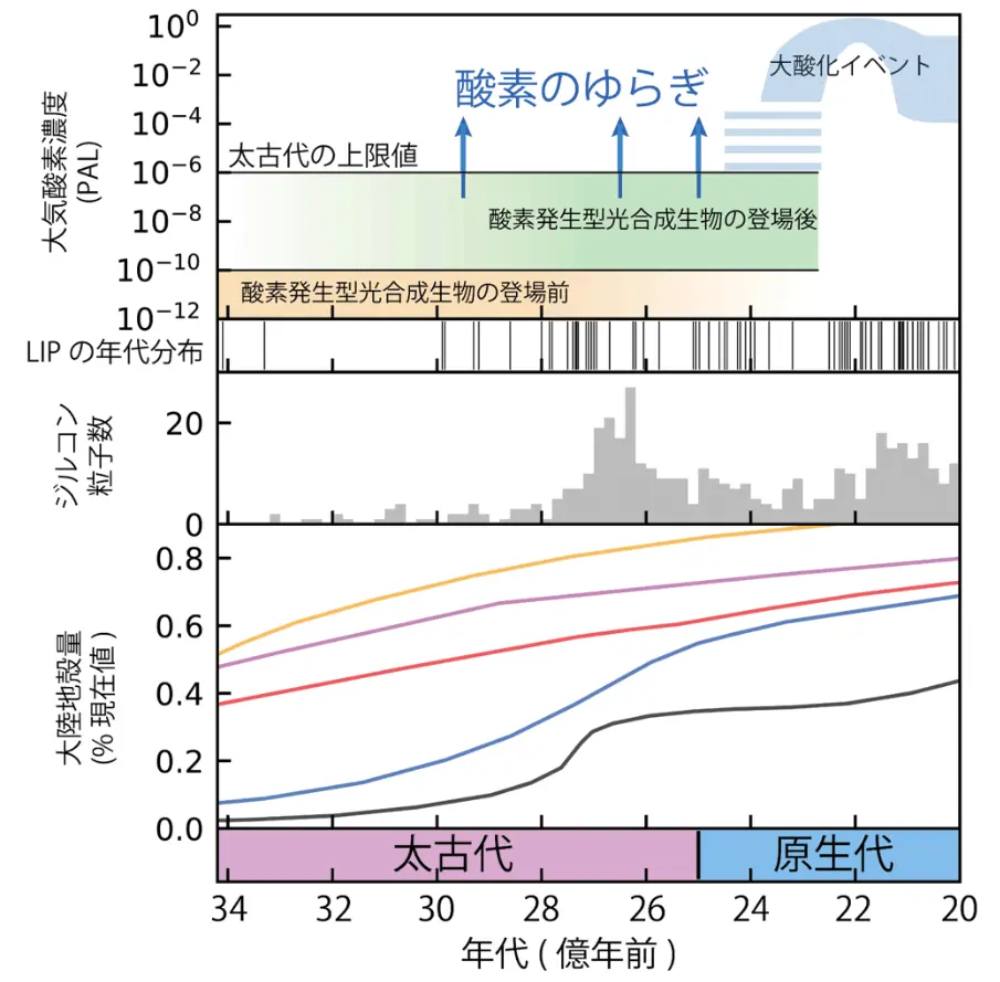 上段から大気酸素濃度(0.21気圧を現在値として、それに対する相対値 PAL で表す)、巨大火成岩岩石区(LIP)の活動、河川堆積物中のジルコン(沈み込み帯における花崗岩質火成活動)の年代分布、大陸成長のさまざまなモデル。