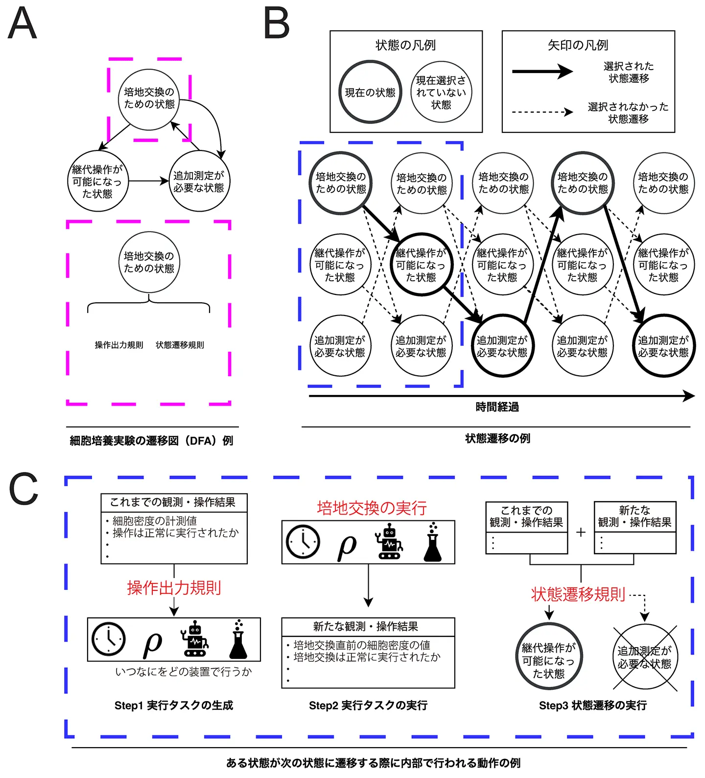 B)細胞培養実験における状態遷移の例。三つの細胞の状態(「培地交換のための状態」「継代操作が可能になった状態」「追加測定が必要な状態」)のいずれかが選択され、その状態で実行される観測・操作結果により次に遷移する状態が決定される。同じ操作を繰り返す場合も、手順を戻すのではなく、時系列に沿って進む状態遷移の連続として扱うことができる。