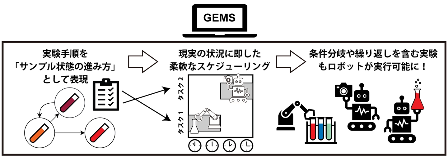 東京科学大学 総合研究院 難治疾患研究所 ロボット科学分野の神田元紀教授、理化学研究所(理研) 生命機能科学研究センター AI生物学研究チームの尾崎遼チームディレクター、筑波大学 ヒューマニクス学位プログラムの田原(新井)悠也大学院生(理研 生命機能科学研究センター AI生物学研究チーム研修生)らの共同研究グループは、実験科学において従来は自然言語で記述されてきた実験手順[用語1]を、「実験が進むとサンプルの状態[用語2]がどのように変化するか」という観点で整理し、実験中の観測・操作結果に応じて「今の状態で行う実験操作」と「次に遷移するサンプル状態」を自動的に選択しながら実験を自律運用するソフトウエア基盤「GEMS(General Experimental Management System)」を開発しました。