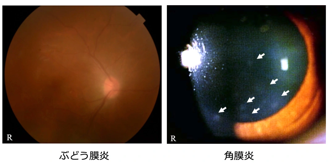 その後、長期にわたるフォローアップの中で、HTLV-1ぶどう膜炎の再発を繰り返し遷延するとともに、経過中にHTLV-1角膜炎が発症し、その再発・遷延も認められました(図2)。